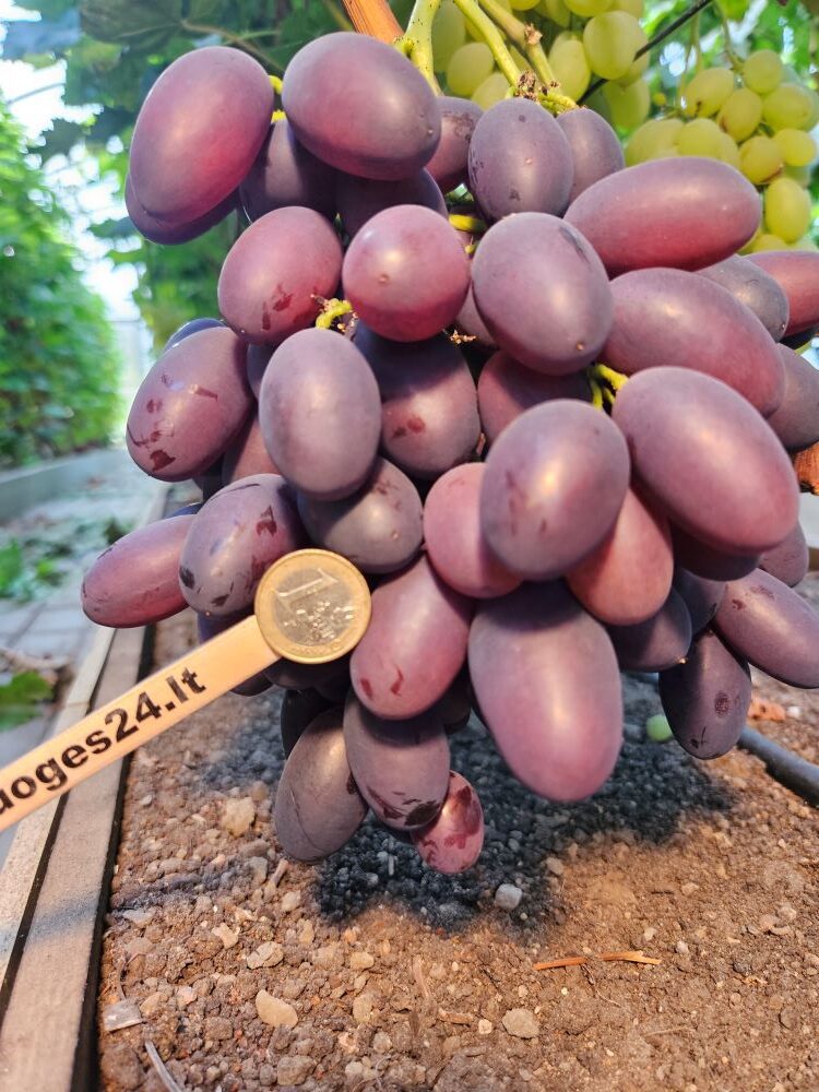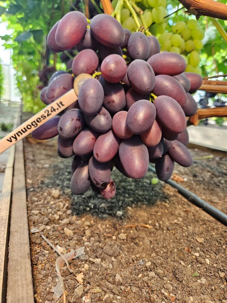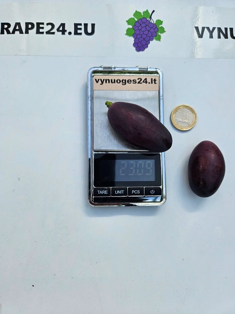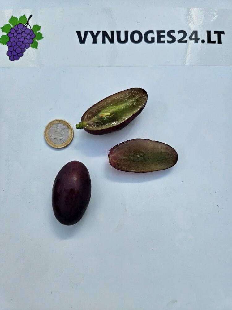 Alpha grapes are a table form with a very early ripening period of 110-115 days. Bunches large, medium dense, cylindrical 700-1500 grams. Berries 26×36 mm, dark colour. Weight 18-20 g. Flesh very dense, crisp, fleshy, juicy, with good sugar. Alpha grapes are very prolific. The flavour is harmonious and varied. The growth vigour of this form is high. Yields are high and require compulsory rationing. Alpha grapes have a cold hardiness of -23 °C. The berries do not crack from excess moisture.