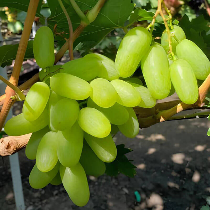 “Vystavochny” is a new hybrid grape variety bred by V.M. Kalugin. Ripening period is early or early-mid, 115-125 days. The flower type is bisexual. Growth is vigorous, and the vine ripens well. The berries are oval-cylindrical, white, with a tanned color in the sun and a greenish tint in the shade. Bunches range from 500–1000 g, with berries weighing 12–16 g. The flesh is fleshy and juicy, and the skin is edible. The berry flavor is pleasant and harmonious. Frost resistance: -23°C