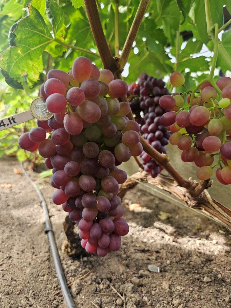 Black Monukka (kishmis) is a seedless, early ripening grape variety. Its place of origin is Asia. It belongs to the ecogeographical group of oriental grape varieties. The bunches are cylindrical in shape. The berries are medium-sized, oval, slightly rounded at the top, dark blue in colour, with a rich waxy coating and thin skin. The flesh is dense and crisp.Ripening period: Early-mid-season (growing season is approximately 110-130 days).Berries: Medium-sized (weight 2-3 g), oval-shaped, black with a rich bluish waxy bloom. The flesh is firm and crisp, the skin is thin and easy to eat.Bunches: Medium-sized (weight 100-400 g), cylindrical or conical, sometimes with a “wing.”Taste: Harmonious, rich, with a high sugar content.