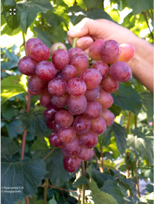 A new hybrid form, the early-ripening “Hudoznik” grape variety, bred by V.M. Kalugin. It ripens early or early-mid-season (mid-to-late August). The bush is vigorous, and the vine ripens well. The clusters are very large, averaging 800-1200 g or larger, cylindrical-conical, and moderately loose. The berries are very large, oval, dark pink-red, weighing 14-16 g, and covered with a medium-thick waxy coating. The flesh is fleshy and juicy, and the skin is medium thick. The flavor is pleasant and harmonious. The yield is high. Resistance to fungal diseases is average.