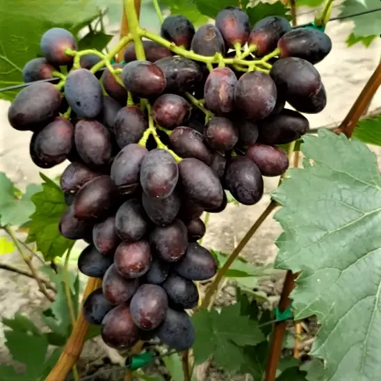 A new table hybrid grape variety, “Red Arrow”, bred by V.M. Kalugin, is mid-late ripening. The bush is vigorous, and the vine ripens well. Bunches are medium-dense, averaging 900-1300 grams and larger. Berries are very large (55×26 mm, 20-25 grams), red in color. The flesh is crisp, with a harmonious, varietal-typical flavor. It is highly transportable. Disease resistance and frost hardiness are being studied.