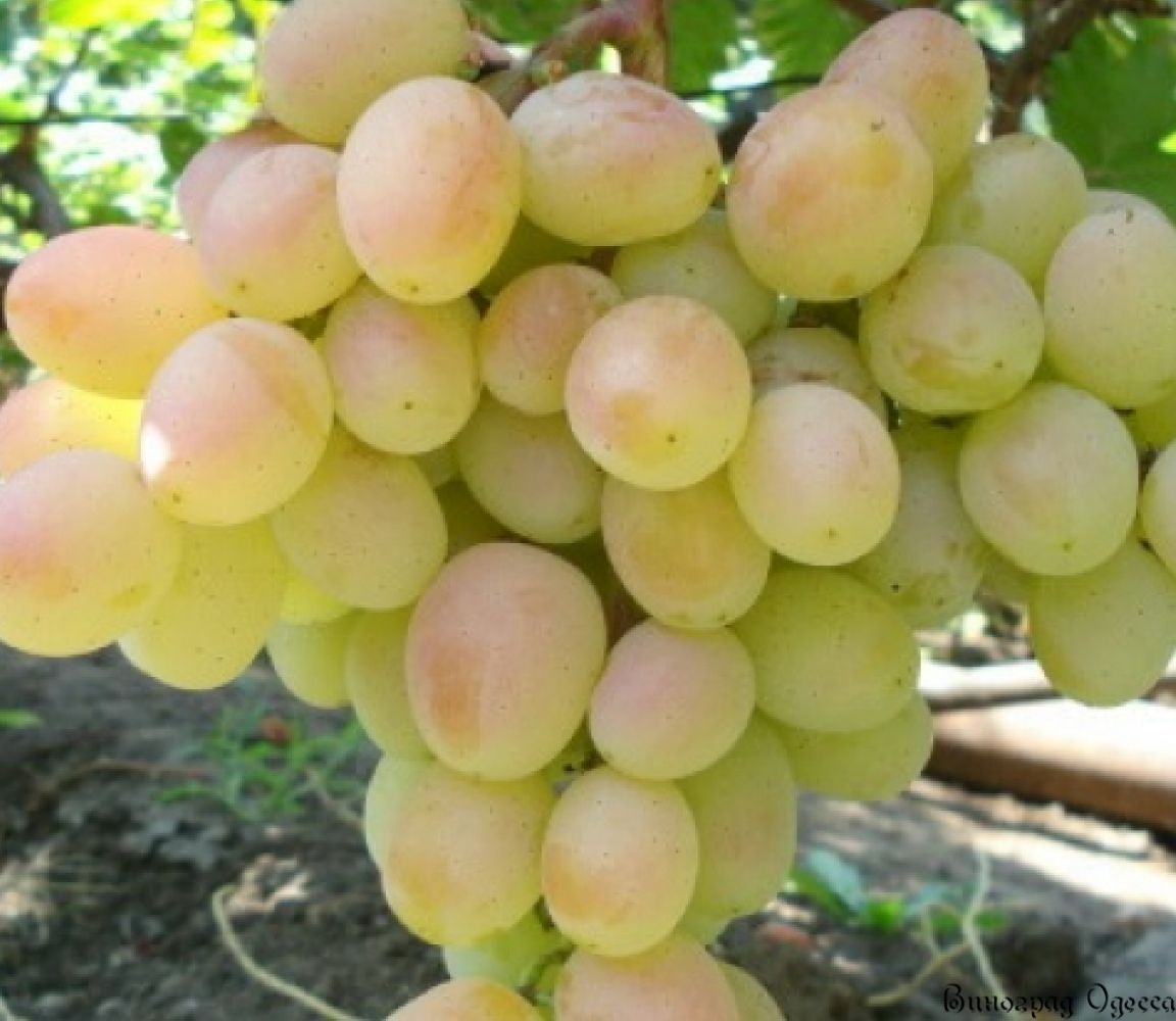 ‘Krasnoshchekiy’ is a modern hybrid table grape variety bred by V. M. Kalugin. Ripening is early or early-mid (100-110 days on average); the harvest is usually ready in the second half of August. The berries are very large, weighing from 16 to 30 grams. The color is yellow with a distinct red or pink tan. The flesh is dense, crisp, and white. Taste: Harmonious, sweet, with good sugar accumulation. Bunches are large, weighing 600-1200 grams. The bushes have great growth vigor; the vines ripen well. Frost resistance is -23°C. The variety is valued for its resistance to cracking.