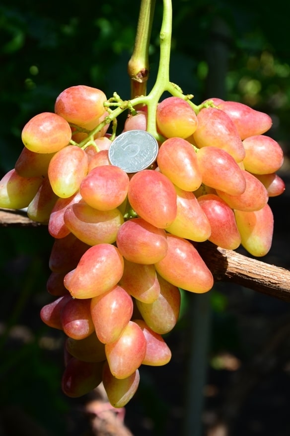 “Krypton” is a hybrid grape variety bred by A.V. Karpushev. The bushes are tall and productive, with excellent vine ripening. The bunches are large, conical, and moderately dense. The bunches are large, weighing 650-1100 grams, and have a wide cylindrical shape. The berries are large, weighing 10-14 grams, measuring 38 x 24 mm, very sweet, crisp, and a beautiful yellow-pink color, elongated and pointed. Highly resistant to diseases and berry cracking. Very early ripening. Frost tolerance: -24°C.