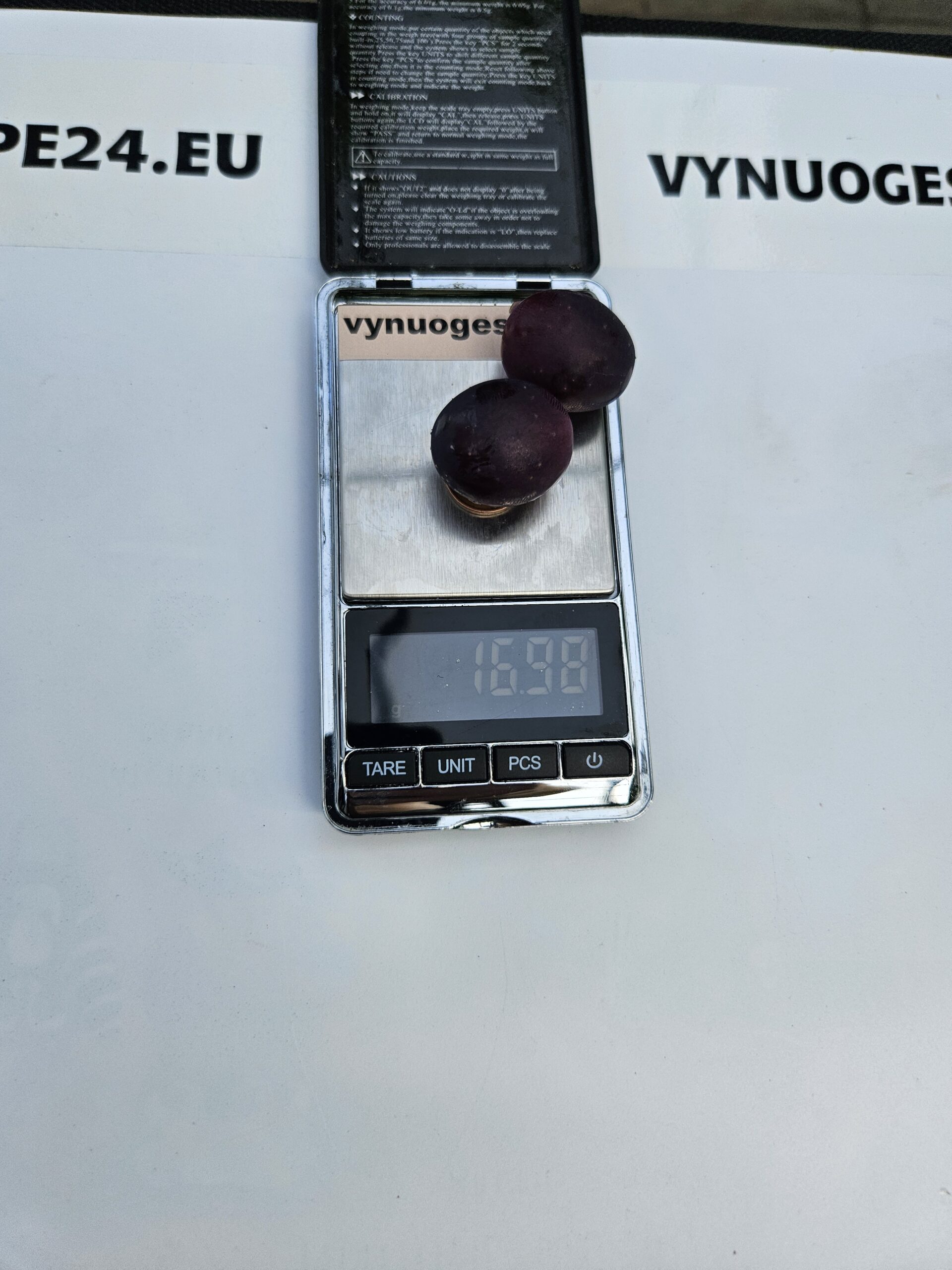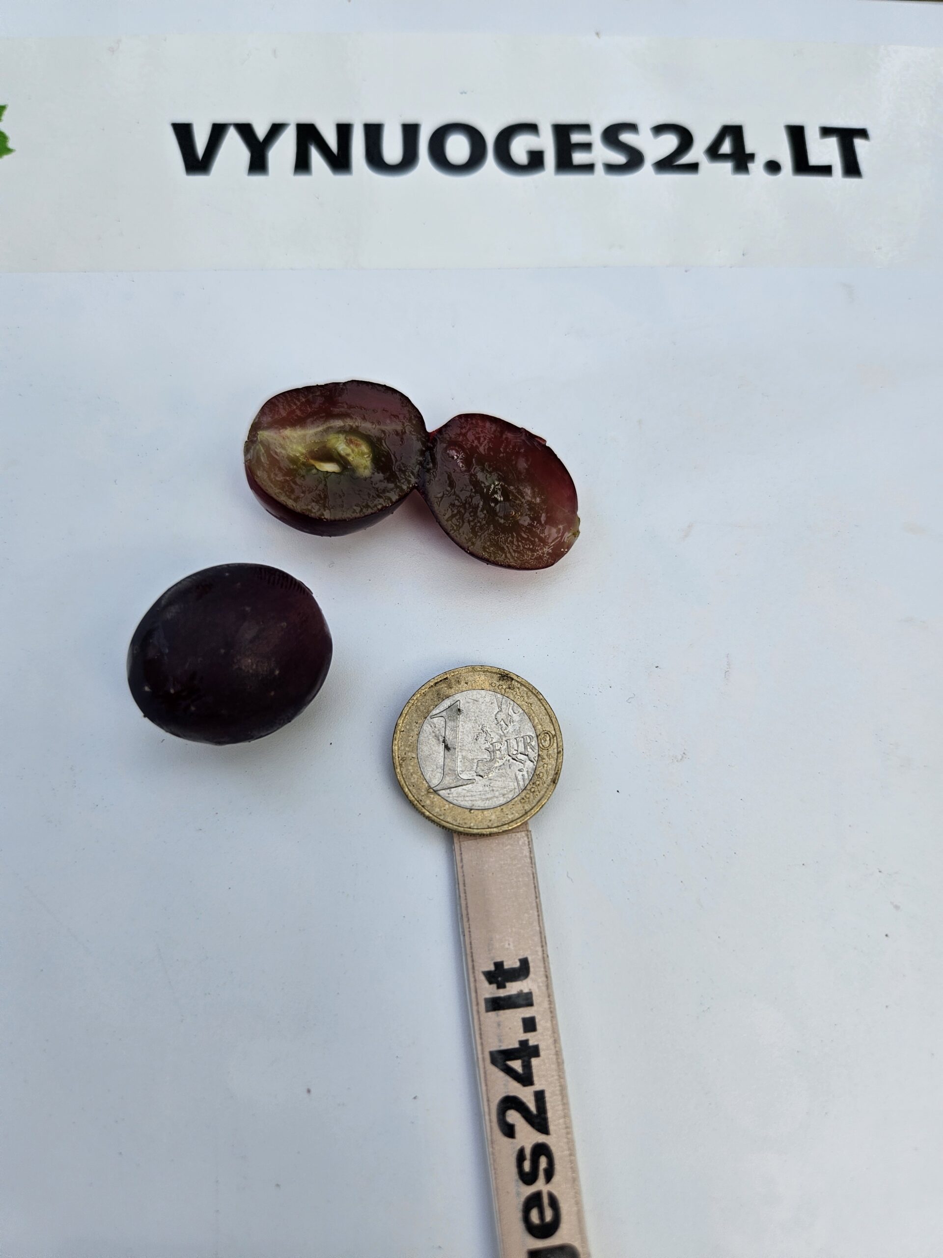 Early ripening (110-120 days). In a normal year, it ripens on August 15-20. The bunches are very large, of medium density, weighing 600-900 g.. The berries are oval, large, weighing 10-12 g., red-violet in color, when fully ripe they are dark purple. The pulp is of medium density, fleshy, with a pleasant taste, with a fresh nutmeg aroma. The skin is thin. The grape variety is frost-resistant to -23°С.